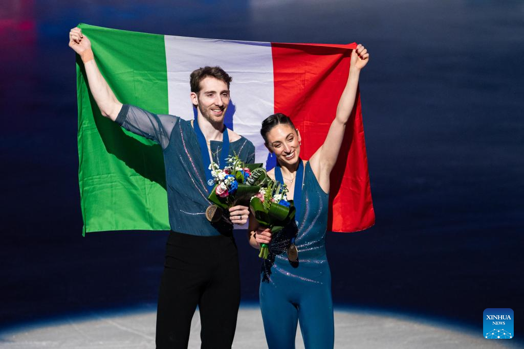 Bronze medalists Sara Conti (R)/Niccolo Macii of Italy pose for pictures during the awarding ceremony for the pairs skating event at the ISU 2025 World Figure Skating Championships in Boston, the United States on March 27, 2025. (Photo by Ziyu Julian Zhu/Xinhua)