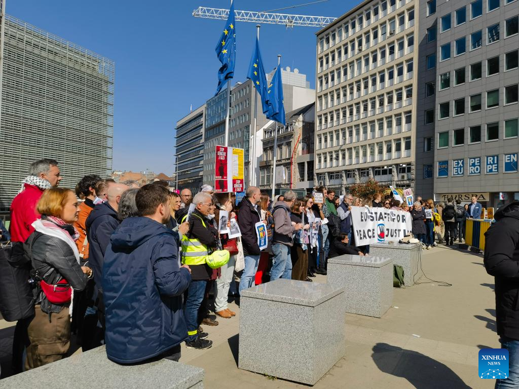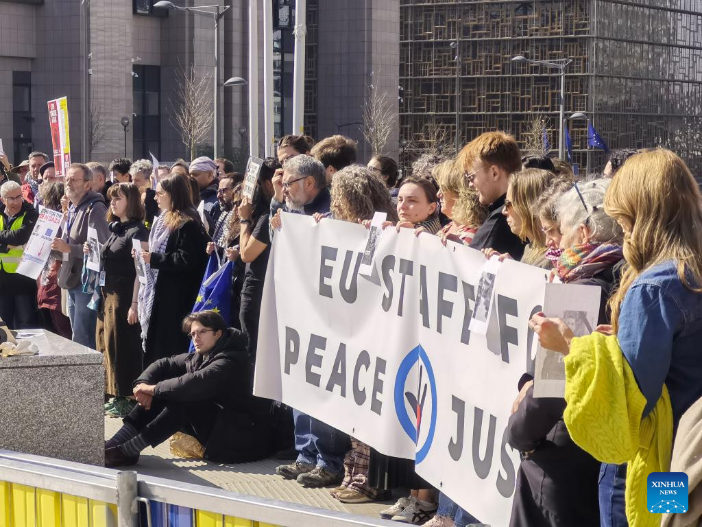 BRUSSELS, March 27 (Xinhua) -- Sunlight bathed the Schuman roundabout in Brussels, the symbolic heart of the European Union, at noon on Thursday. Surrounded by the European Commission and the Council of the EU, a group of EU staff quietly gathered in front of the Berlaymont building for a silent protest demanding peace and justice in Gaza.