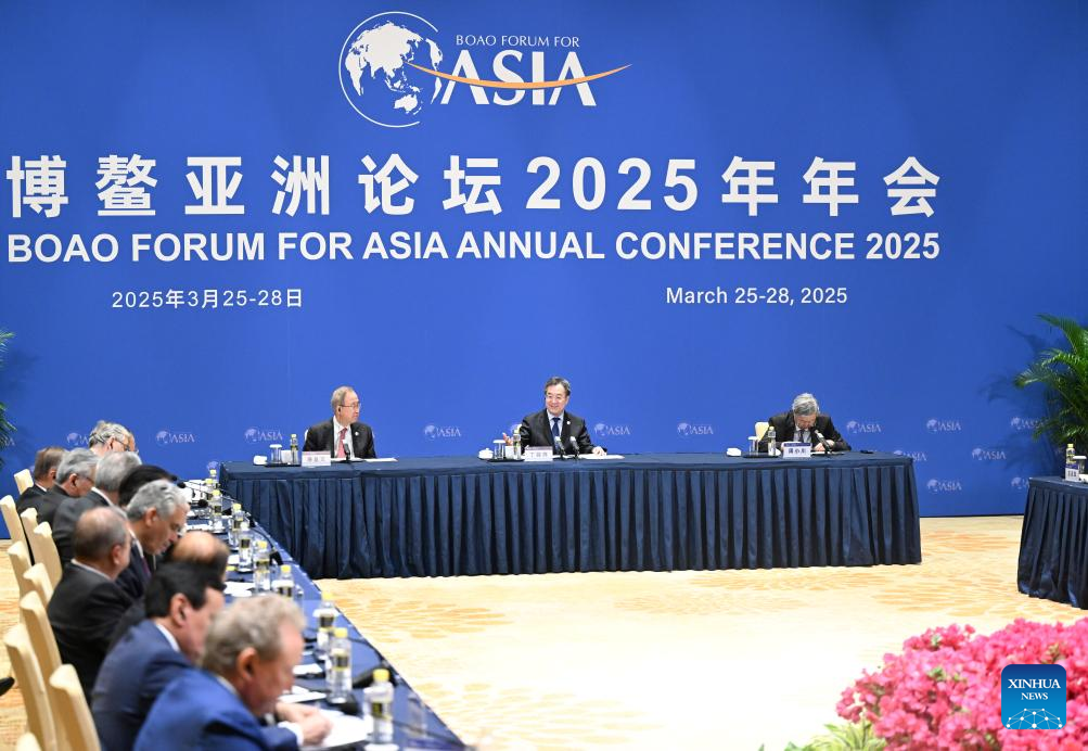 Chinese Vice Premier Ding Xuexiang, also a member of the Standing Committee of the Political Bureau of the Communist Party of China Central Committee, meets with members of the Board of Directors of the Boao Forum for Asia (BFA) and representatives of the board's corporate members in Boao, south China's Hainan Province, March 27, 2025. (Xinhua/Li Xiang)