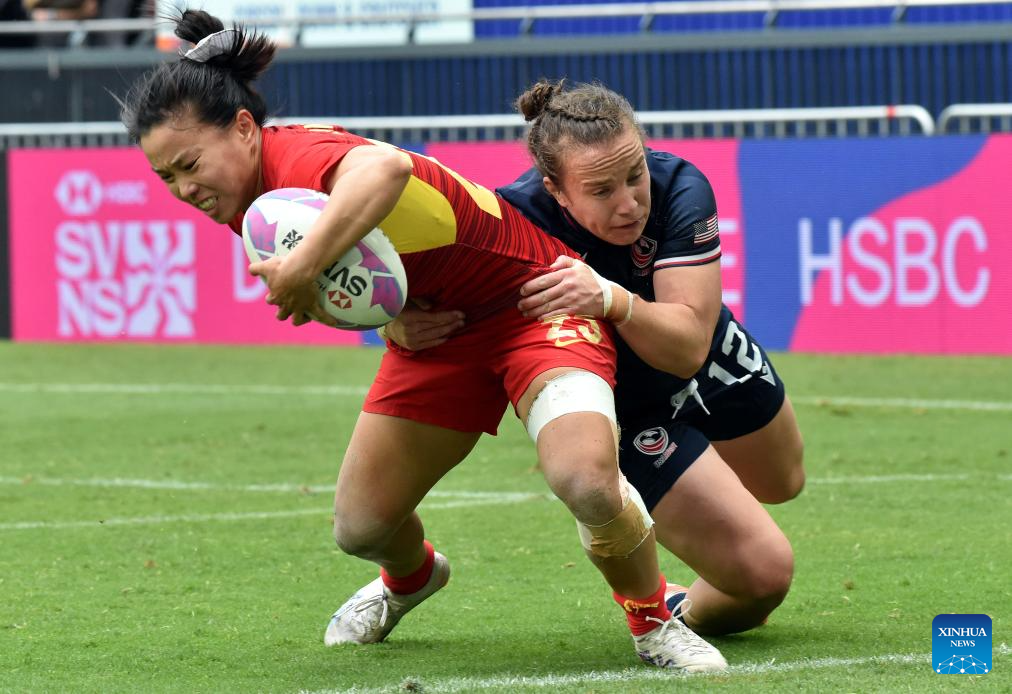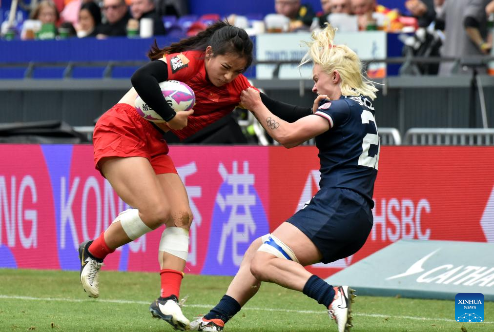Sammy Sullivan (R) of the United States defends China's Zhang Le during the women's Pool A match between China and the United States at World Rugby Sevens Series 2025 in south China's Hong Kong, March 29, 2025. (Xinhua/Lo Ping Fai)