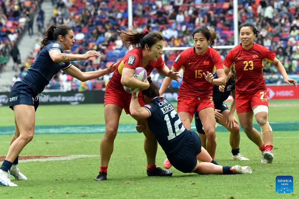China's Jiang Yutong (2nd L) vies with Kristi Kirshe (C) of the United States during the women's Pool A match between China and the United States at World Rugby Sevens Series 2025 in south China's Hong Kong, March 29, 2025. (Xinhua/Lo Ping Fai)