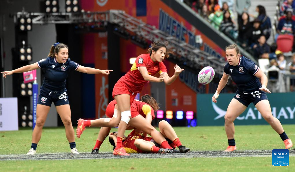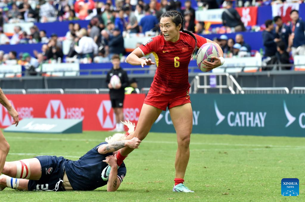 China's Dou Xinrong (C) passes the ball during the women's Pool A match between China and the United States at World Rugby Sevens Series 2025 in south China's Hong Kong, March 29, 2025. (Xinhua/Lo Ping Fai)