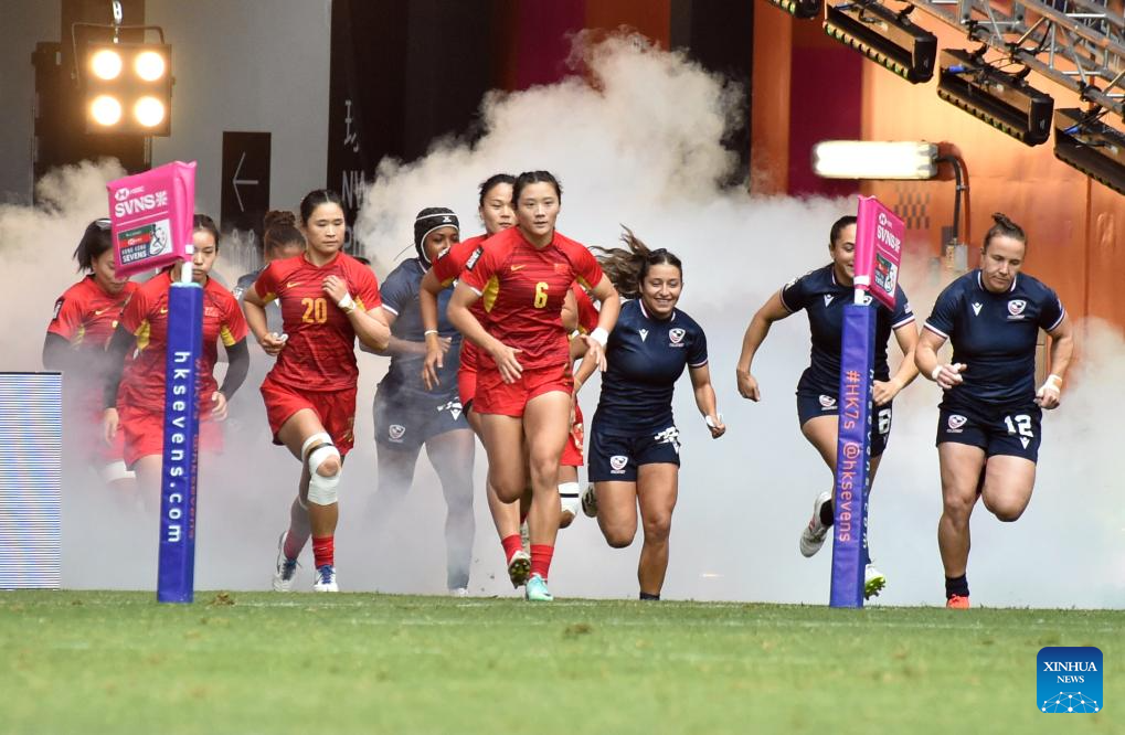 Players run into the pitch before the women's Pool A match between China and the United States at World Rugby Sevens Series 2025 in south China's Hong Kong, March 29, 2025. (Xinhua/Lo Ping Fai)