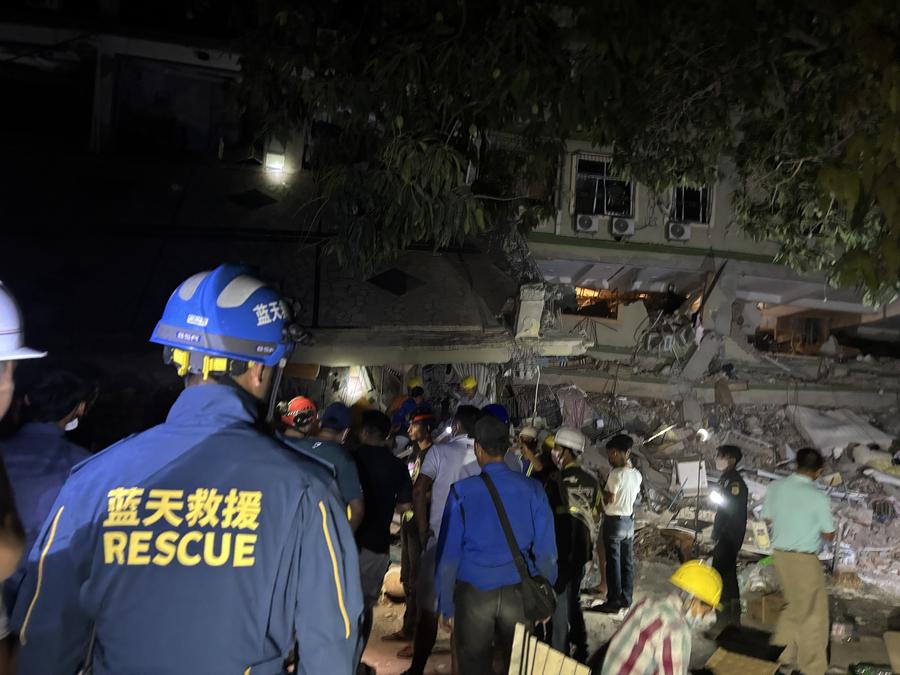 An advance team of China's Blue Sky Rescue arrived in Mandalay early on Sunday, another hard-hit city in Myanmar. The team members are stepping up the investigation and assessment of a local hotel, among other disaster relief sites.