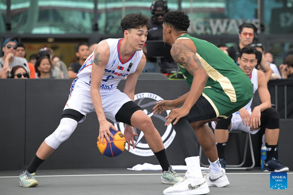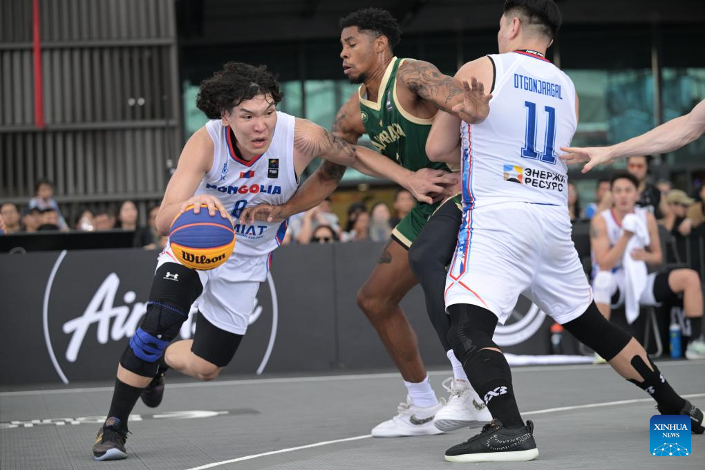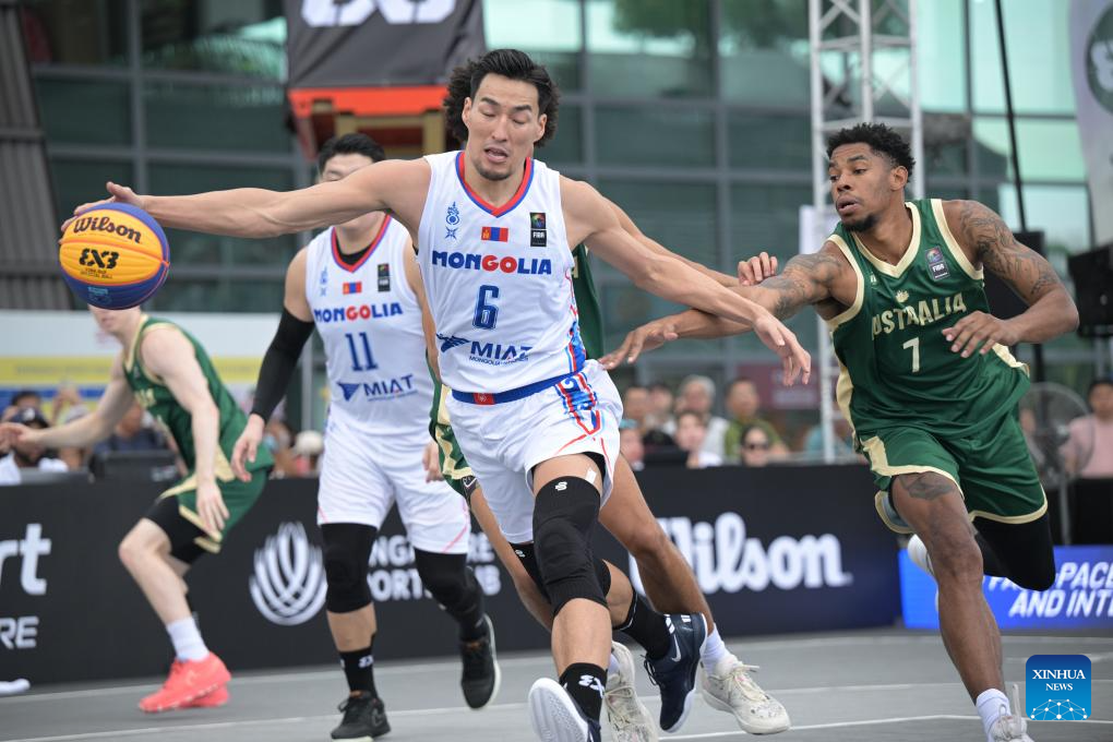 Anand Ariunbold (L) of Mongolia controls the ball during the FIBA 3x3 Basketball Asia Cup men's quarterfinal match between Mongolia and Australia in Singapore, March 30, 2025. (Photo by Then Chih Wey/Xinhua)