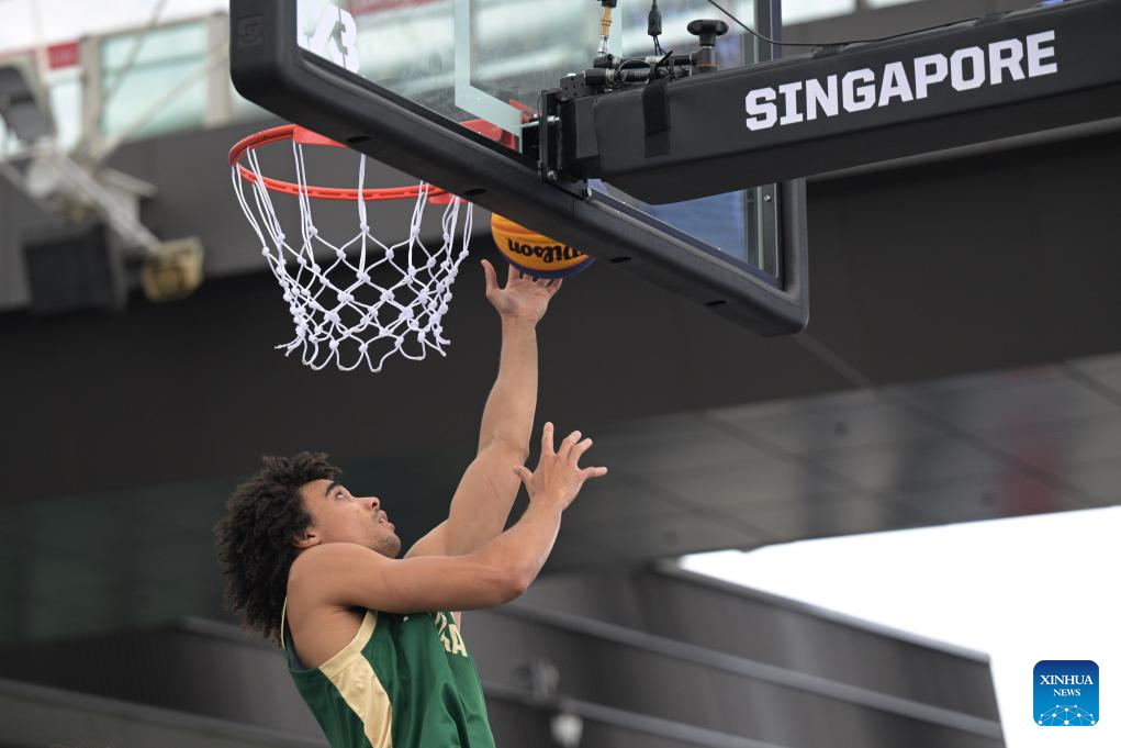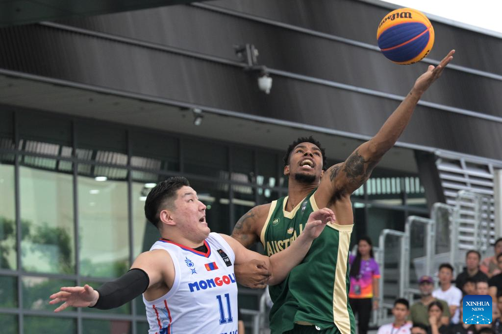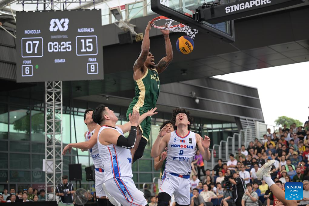 Alex Higgins-Titsha of Australia goes for a lay-up during the FIBA 3x3 Basketball Asia Cup men's quarterfinal match between Mongolia and Australia in Singapore, March 30, 2025. (Photo by Then Chih Wey/Xinhua)