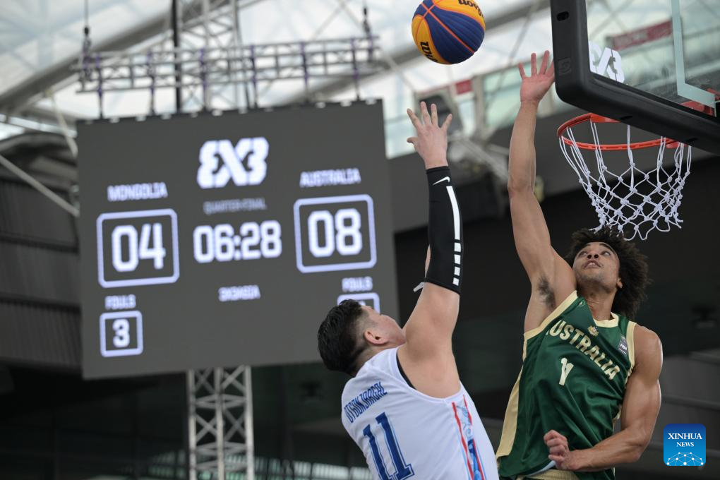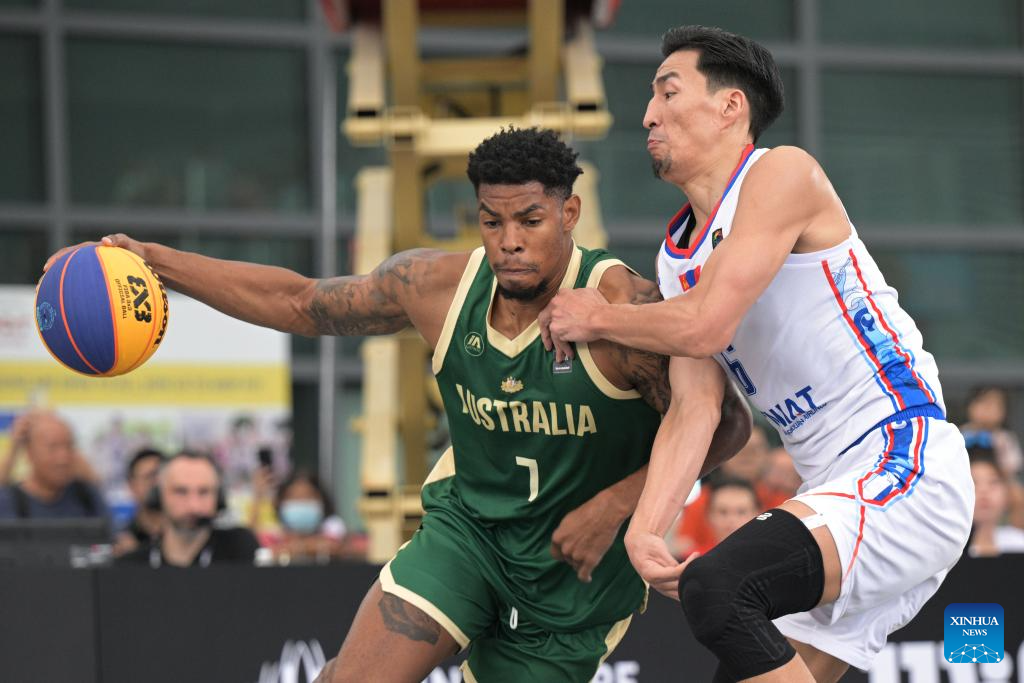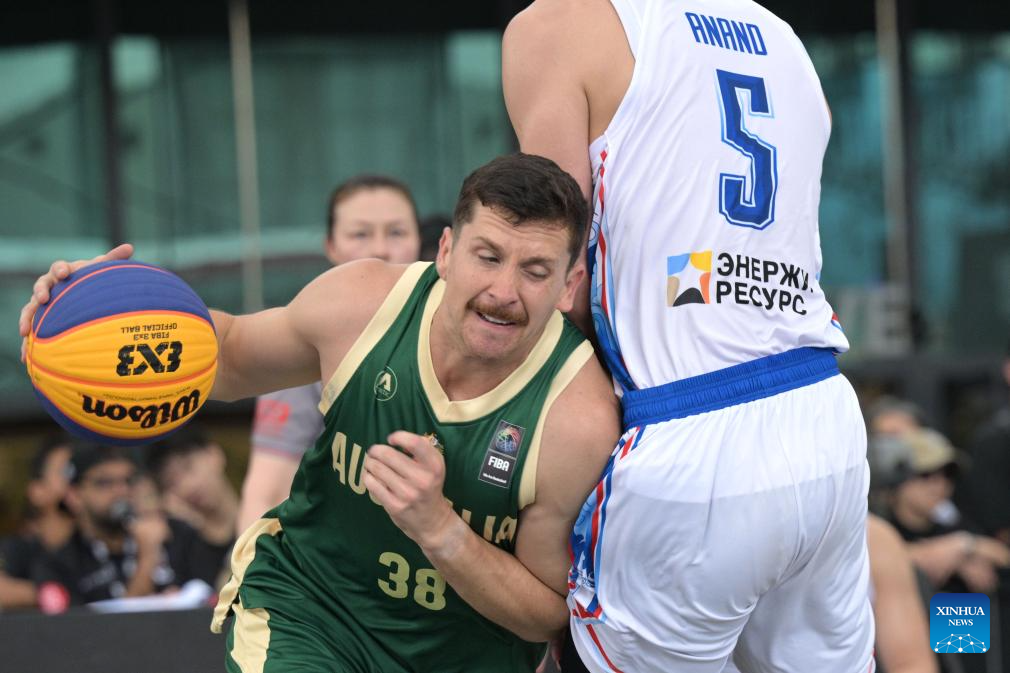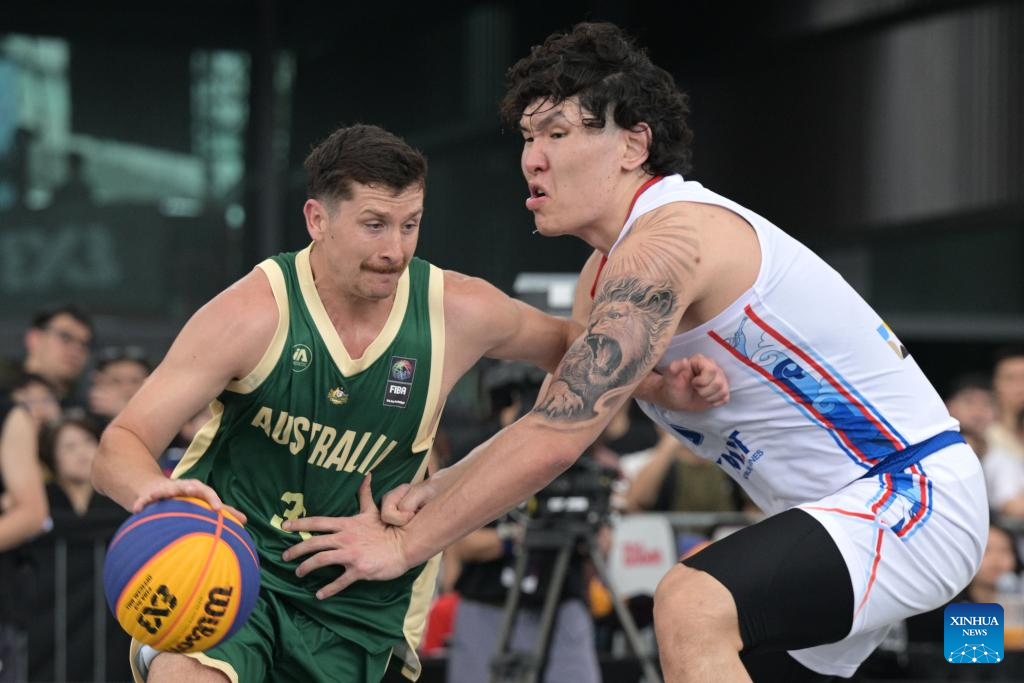 Lachlan John Barker (L) of Australia breaks through during the FIBA 3x3 Basketball Asia Cup men's quarterfinal match between Mongolia and Australia in Singapore, March 30, 2025. (Photo by Then Chih Wey/Xinhua)