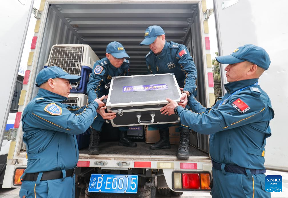 Members of the Blue Sky Rescue team, a Chinese civil relief squad, check the rescue equipment before departure in southwest China's Chongqing Municipality, March 30, 2025. Sixteen members of the Chongqing Blue Sky Rescue team set off for the quake-hit Myanmar on Sunday to provide assistance in rescue efforts. (Photo by Feng Tao/Xinhua)