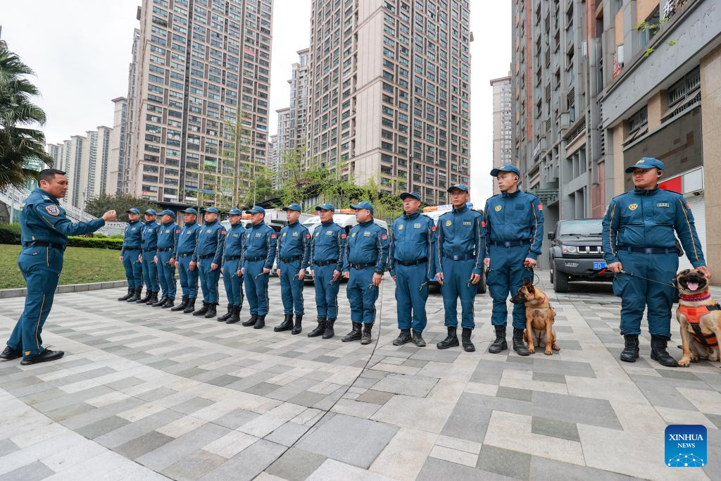 Members of the Blue Sky Rescue team, a Chinese civil relief squad, gather before departure in southwest China's Chongqing Municipality, March 30, 2025. Sixteen members of the Chongqing Blue Sky Rescue team set off for the quake-hit Myanmar on Sunday to provide assistance in rescue efforts. (Photo by Feng Tao/Xinhua)