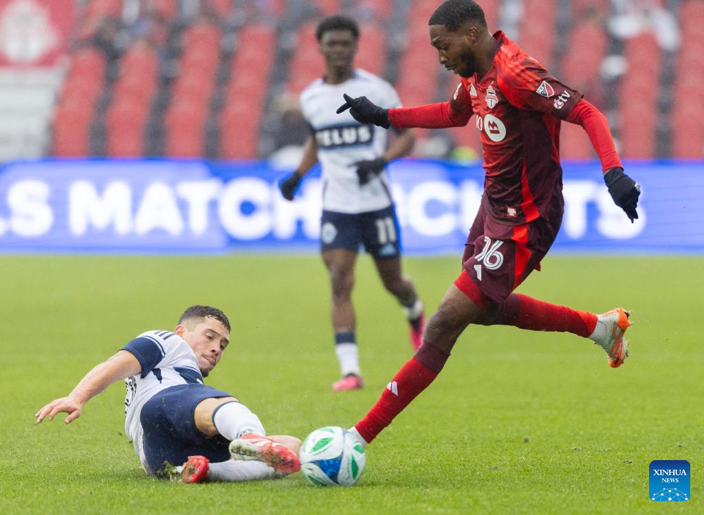 Pedro Vite (C) of Vancouver Whitecaps FC breaks through during the 2025 Major League Soccer (MLS) regular season match between Toronto FC and Vancouver Whitecaps FC at BMO Field in Toronto, Canada, March 29, 2025. (Photo by Zou Zheng/Xinhua)