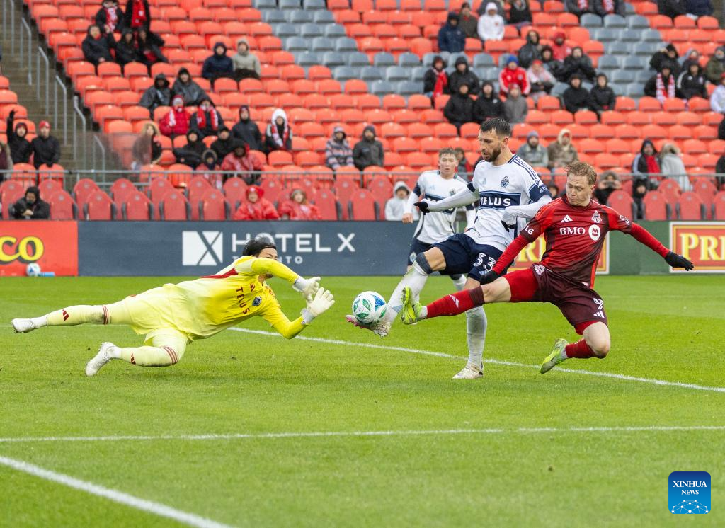 Ola Brynhildsen (1st R) of Toronto FC vies with Tristan Blackmon (2nd R) and goalkeeper Yohei Takaoka (L) of Vancouver Whitecaps FC during the 2025 Major League Soccer (MLS) regular season match between Toronto FC and Vancouver Whitecaps FC at BMO Field in Toronto, Canada, March 29, 2025. (Photo by Zou Zheng/Xinhua)