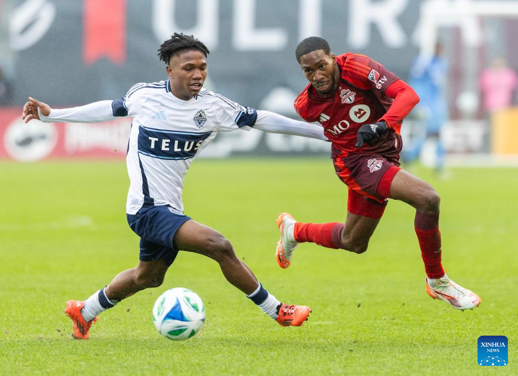 Tyrese Spicer (R) of Toronto FC vies with Edier Ocampo of Vancouver Whitecaps FC during the 2025 Major League Soccer (MLS) regular season match between Toronto FC and Vancouver Whitecaps FC at BMO Field in Toronto, Canada, March 29, 2025. (Photo by Zou Zheng/Xinhua)