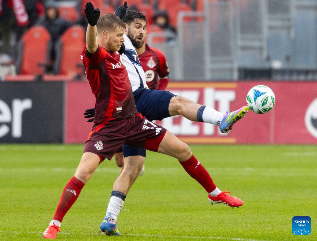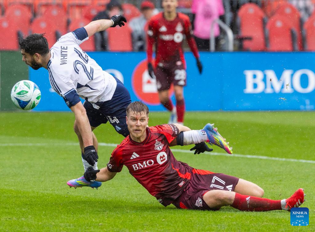 Sigurd Rosted (L) of Toronto FC vies with Brian White of Vancouver Whitecaps FC during the 2025 Major League Soccer (MLS) regular season match between Toronto FC and Vancouver Whitecaps FC at BMO Field in Toronto, Canada, March 29, 2025. (Photo by Zou Zheng/Xinhua)