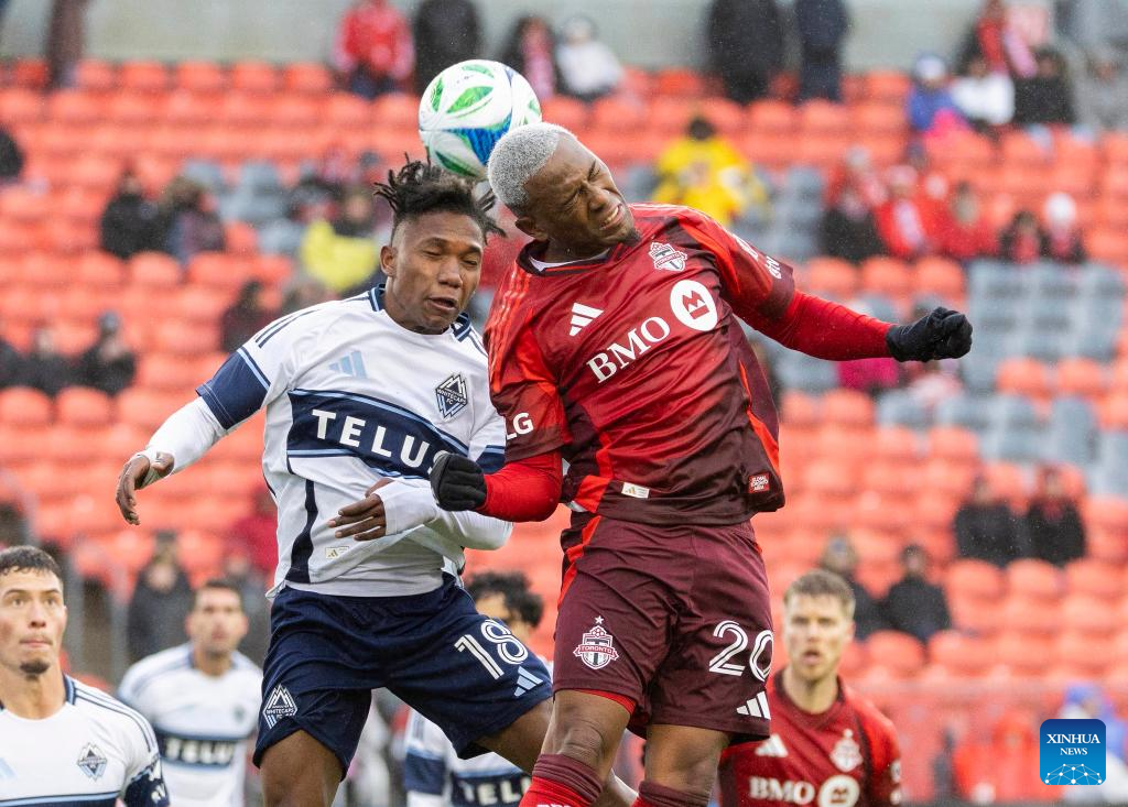 Deiby Flores (R, top) of Toronto FC vies with Edier Ocampo of Vancouver Whitecaps FC for a header during the 2025 Major League Soccer (MLS) regular season match between Toronto FC and Vancouver Whitecaps FC at BMO Field in Toronto, Canada, March 29, 2025. (Photo by Zou Zheng/Xinhua)
