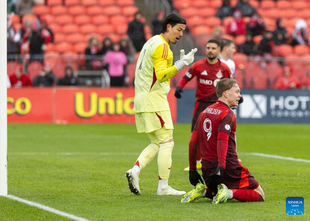 Ola Brynhildsen (R) of Toronto FC reacts after missing a goal during the 2025 Major League Soccer (MLS) regular season match between Toronto FC and Vancouver Whitecaps FC at BMO Field in Toronto, Canada, March 29, 2025. (Photo by Zou Zheng/Xinhua)