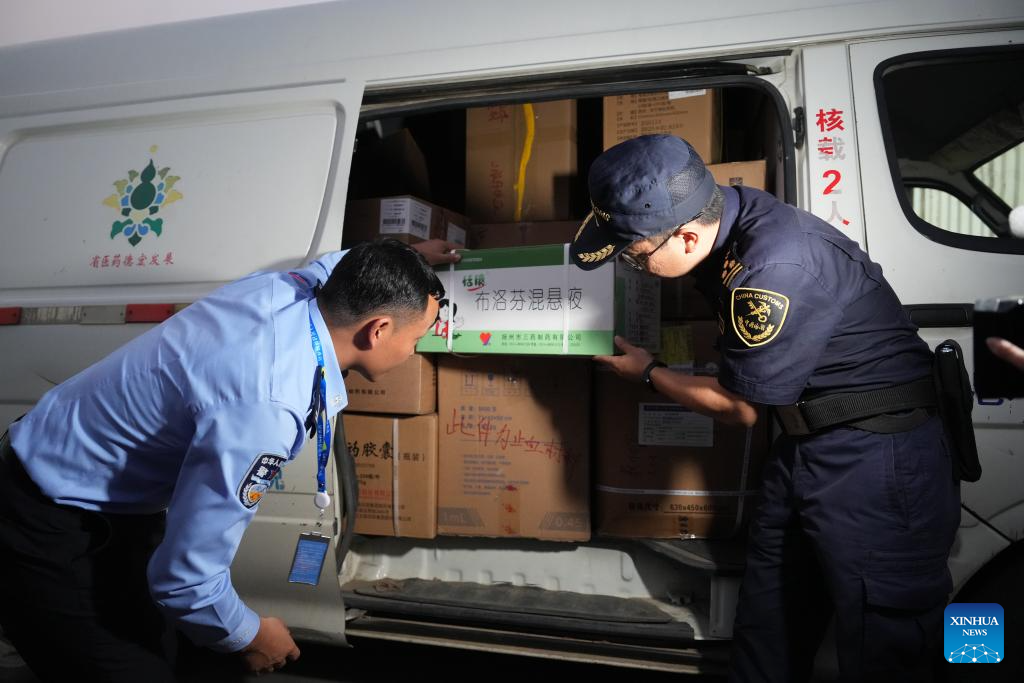 Staff members check medicine to be sent to Myanmar for earthquake relief at a land port in Ruili, southwest China's Yunnan Province, March 29, 2025. Yunnan Province has sent relief supplies to Myanmar on Saturday, after a massive earthquake jolted the Southeast Asian country on Friday. (Xinhua/Chen Xinbo)