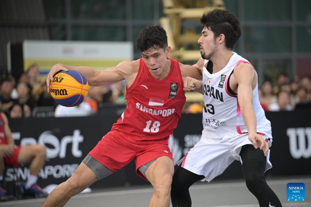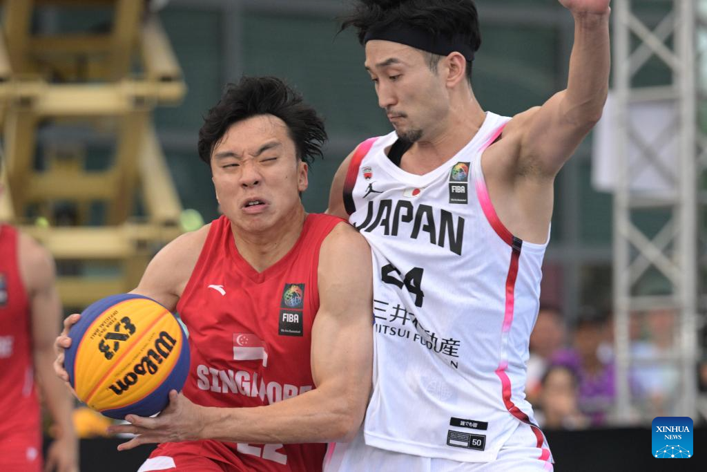 Igo Kenya (R) of Japan guards against Nur Aufa Bin Emil Putra of Singapore during the FIBA 3x3 Basketball Asia Cup men's quarterfinal match between Japan and Singapore in Singapore, March 30, 2025. (Photo by Then Chih Wey/Xinhua)