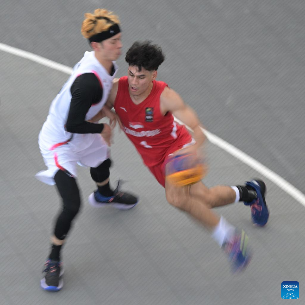 Nakanishi Yuki (R) of Japan guards against Kelvin Lim Hong Da of Singapore during the FIBA 3x3 Basketball Asia Cup men's quarterfinal match between Japan and Singapore in Singapore, March 30, 2025. (Photo by Then Chih Wey/Xinhua)