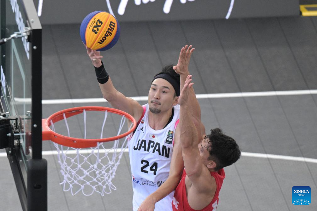 Nakanishi Yuki (L) of Japan lays up to the basket during the FIBA 3x3 Basketball Asia Cup men's quarterfinal match between Japan and Singapore in Singapore, March 30, 2025. (Photo by Then Chih Wey/Xinhua)