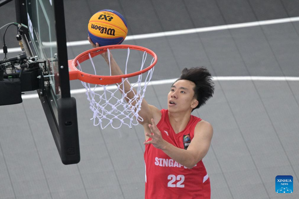 Kelvin Lim Hong Da of Singapore lays up to the basket to score during the FIBA 3x3 Basketball Asia Cup men's quarterfinal match between Japan and Singapore in Singapore, March 30, 2025. (Photo by Then Chih Wey/Xinhua)
