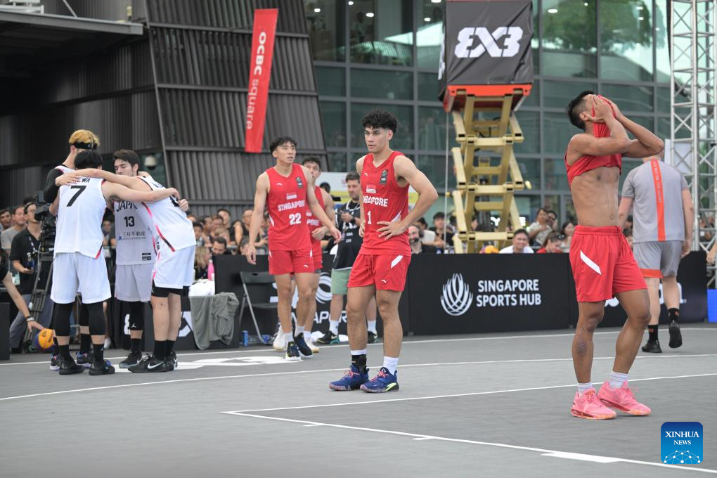 Players of Japan (L) celebrate after winning during the FIBA 3x3 Basketball Asia Cup men's quarterfinal match between Japan and Singapore in Singapore, March 30, 2025. (Photo by Then Chih Wey/Xinhua)