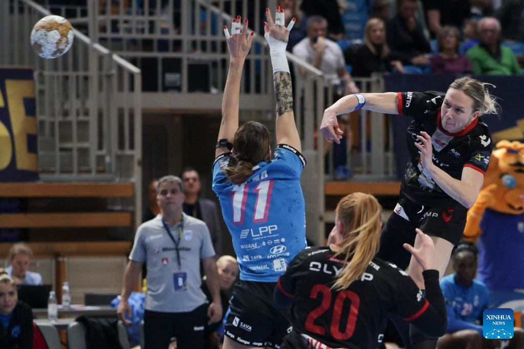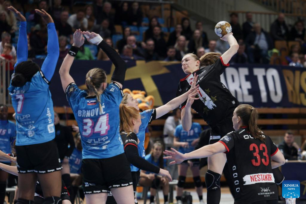 Ana Gros (L) of Krim Mercator Ljubljana shoots at the goal during the EHF Champions League Women's playoff match between Krim Mercator Ljubljana and HB Ludwigsburg in Ljubljana, Slovenia, March. 30, 2025. (Photo by Zeljko Stevanic/Xinhua)