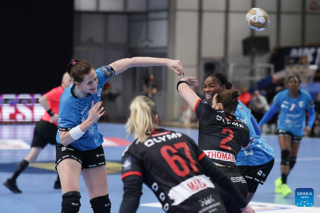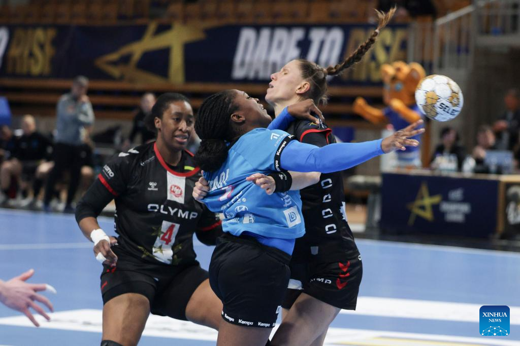 Grace Zaadi Deuna (C) of Krim Mercator Ljubljana competes with Viola Leuchter (R) of HB Ludwigsburg during the EHF Champions League Women's playoff match between Krim Mercator Ljubljana and HB Ludwigsburg in Ljubljana, Slovenia, March. 30, 2025. (Photo by Zeljko Stevanic/Xinhua)