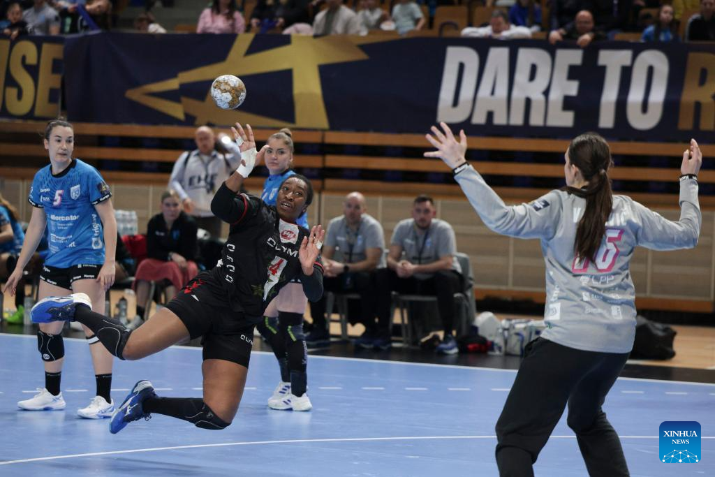 Kaba Gassama Cissokho (C) of HB Ludwigsburg shoots at the goal during the EHF Champions League Women's playoff match between Krim Mercator Ljubljana and HB Ludwigsburg in Ljubljana, Slovenia, March. 30, 2025. (Photo by Zeljko Stevanic/Xinhua)