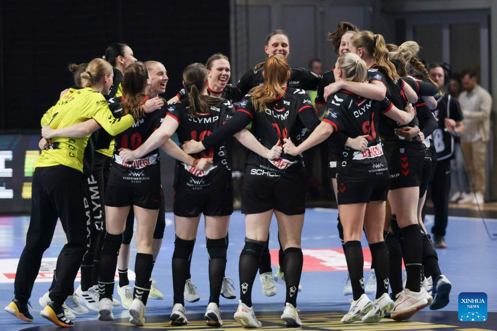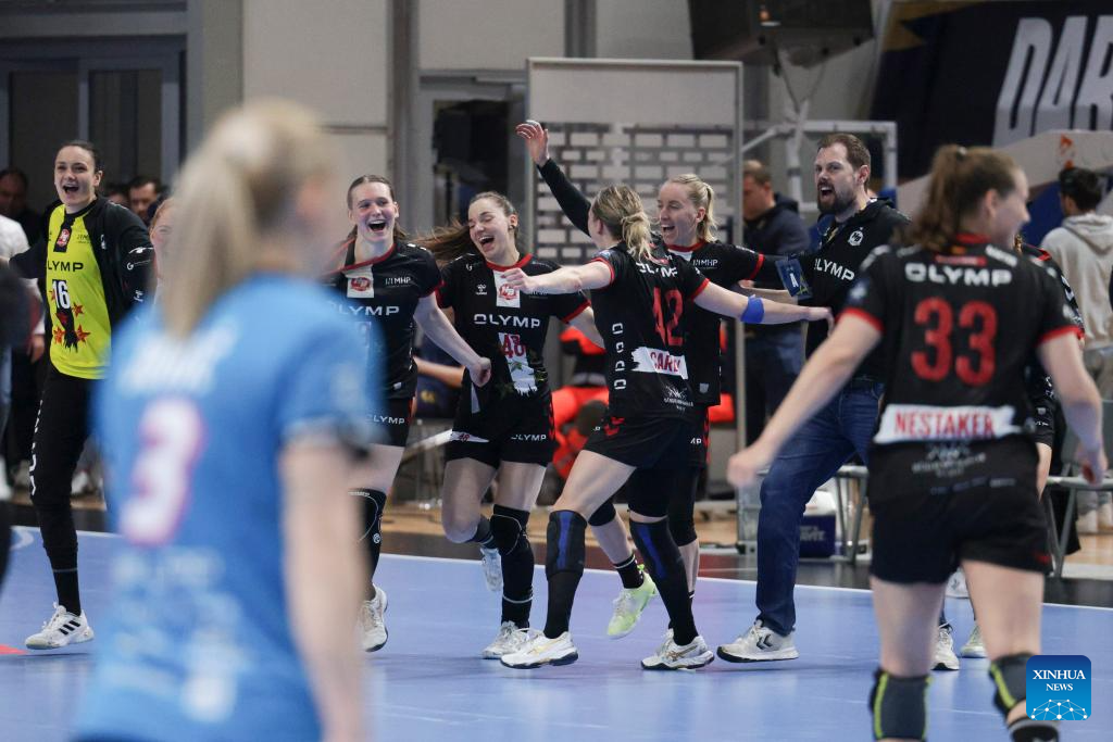 Athletes of HB Ludwigsburg celebrate victory after the EHF Champions League Women's playoff match between Krim Mercator Ljubljana and HB Ludwigsburg in Ljubljana, Slovenia, March. 30, 2025. (Photo by Zeljko Stevanic/Xinhua)