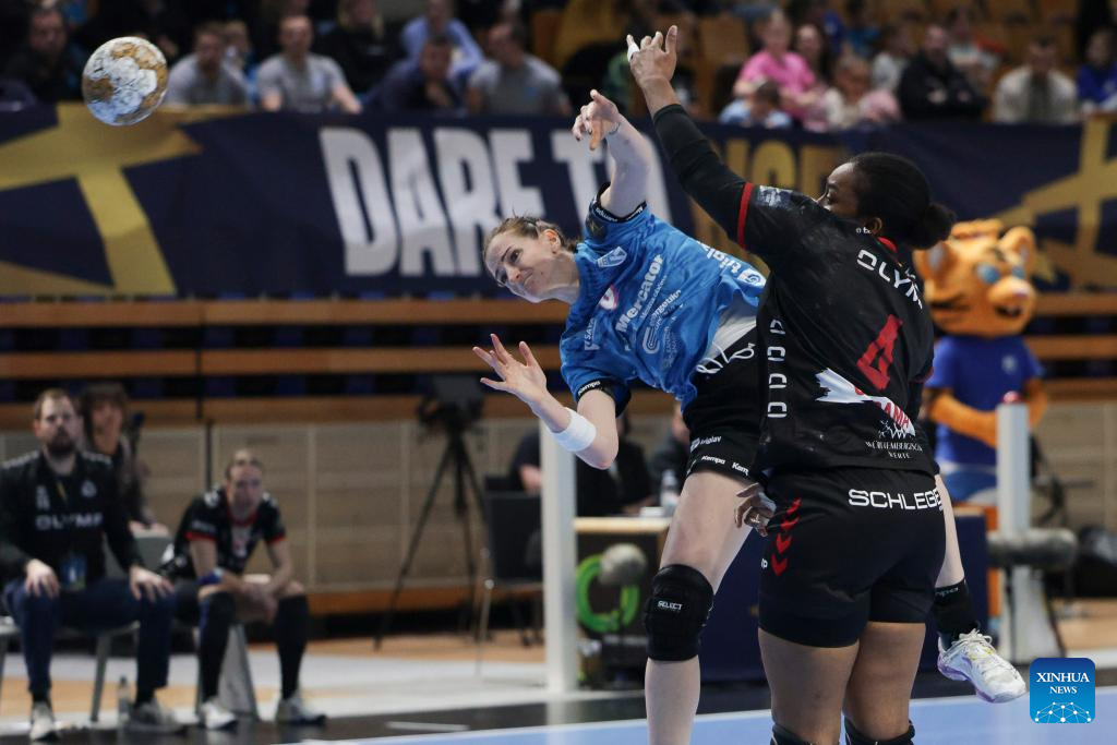 Jenny Carlson (R) of HB Ludwigsburg shoots at the goal during the EHF Champions League Women's playoff match between Krim Mercator Ljubljana and HB Ludwigsburg in Ljubljana, Slovenia, March. 30, 2025. (Photo by Zeljko Stevanic/Xinhua)