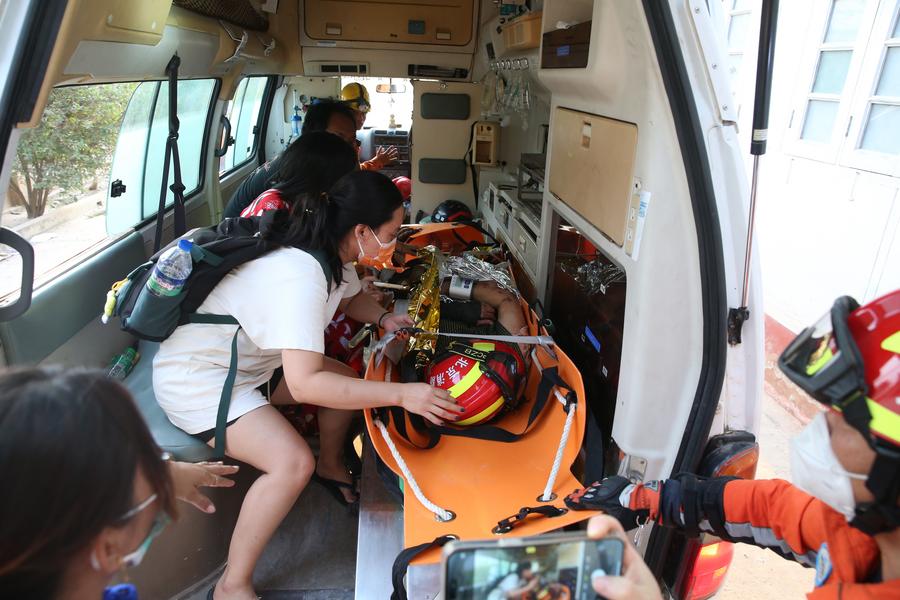 MANDALAY, Myanmar, March 31 (Xinhua) -- Chinese rescuers pulled out three people in the quake-hit Myanmar city of Mandalay within two hours on Monday.