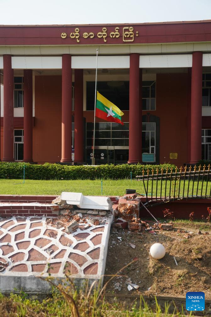 A national flag of Myanmar flies at half-mast at the headquarters of Myanmar Post in Nay Pyi Taw, Myanmar, March 31, 2025. Myanmar's State Administration Council Chairman Senior General Min Aung Hlaing on Monday announced a week-long mourning period following a 7.9-magnitude earthquake that struck Myanmar on March 28. (Photo by Wang Shen/Xinhua)