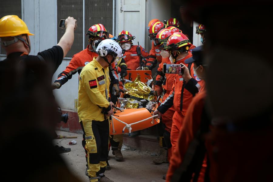 In a separate case at the Sky Villa site, a little girl and her 29-year-old sister were both trapped between floors. The girl climbed out of the debris, thanks to her small size, and came across the Chinese rescue team members.