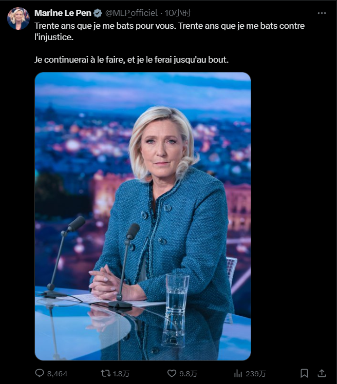 "For thirty years, I've been fighting for you. For thirty years, I've been fighting against injustice. I will continue to do so, and I will do so until the end," Le Pen said on her X account on Monday night.