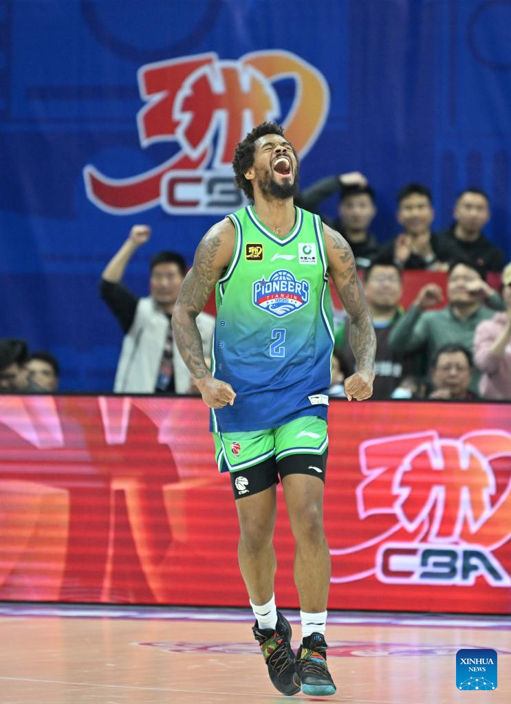 Javion Hamlet of Tianjin Pioneers celebrates during the 46th round match between Tianjin Pioneers and Beijing Ducks at the 2024-2025 season of the Chinese Basketball Association (CBA) league in Tianjin, north China, March 31, 2025. (Xinhua/Sun Fanyue)
