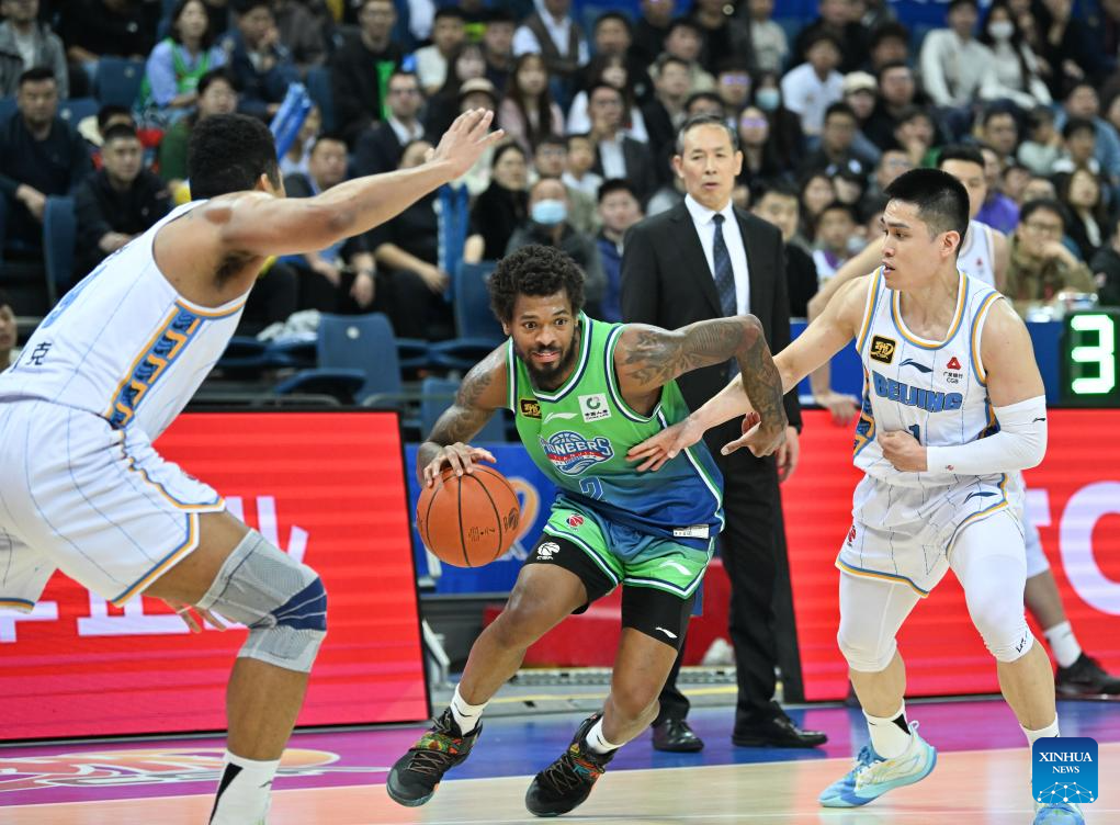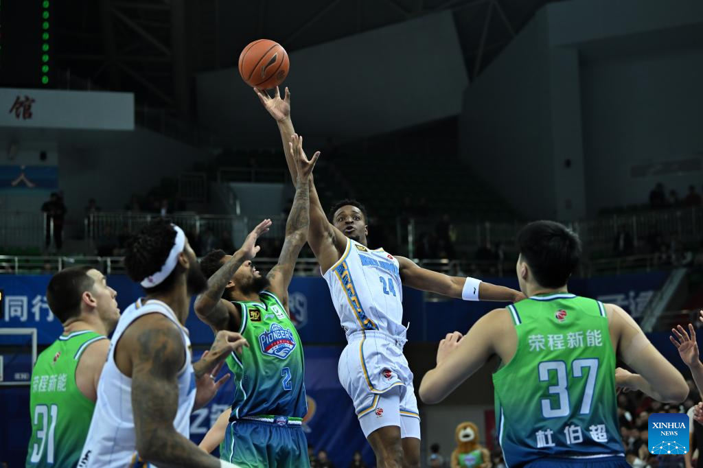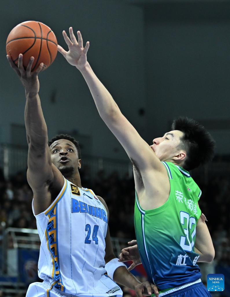 Zachary Nutall (2nd R) of Beijing Ducks shoots during the 46th round match between Tianjin Pioneers and Beijing Ducks at the 2024-2025 season of the Chinese Basketball Association (CBA) league in Tianjin, north China, March 31, 2025. (Xinhua/Sun Fanyue)