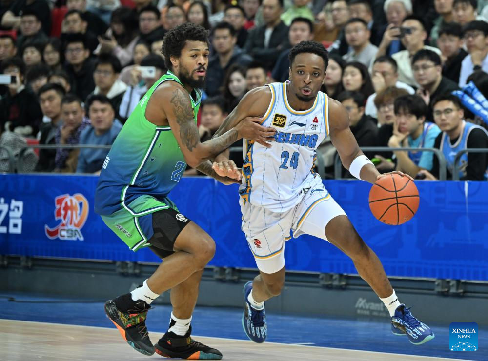 Zachary Nutall (R) of Beijing Ducks breaks through during the 46th round match between Tianjin Pioneers and Beijing Ducks at the 2024-2025 season of the Chinese Basketball Association (CBA) league in Tianjin, north China, March 31, 2025. (Xinhua/Sun Fanyue)