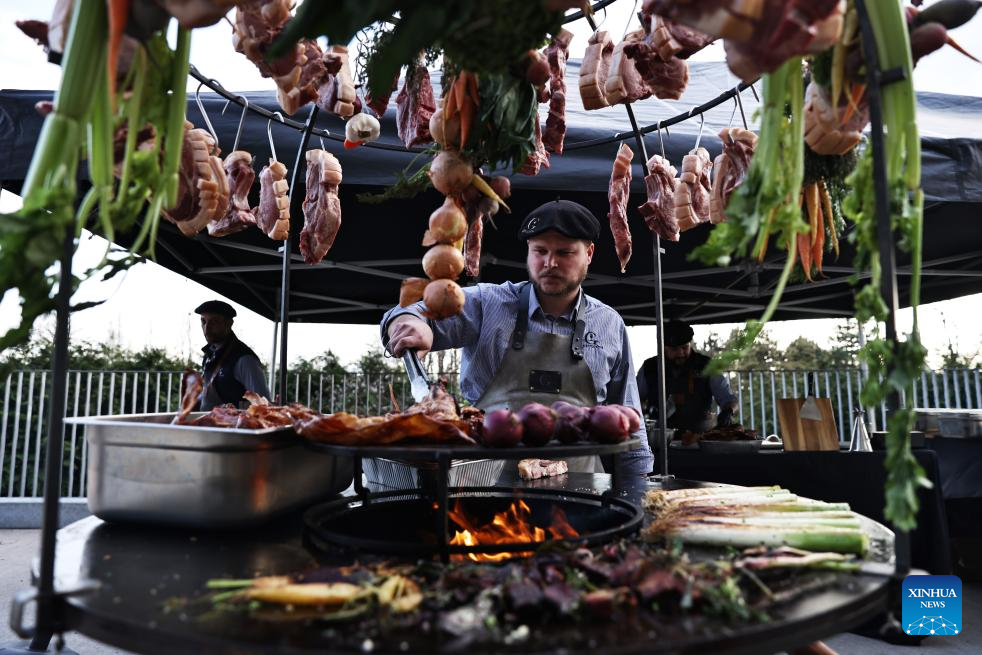 A chef makes grilled pork and vegetable at Chef's dinner organized by the Michelin Guide in Metz, Moselle, the Grand Est Region, France, March 30, 2025. The Michelin Guide France launched its 2025 Ceremony in Metz on Monday. The event unveiled the Michelin Guide France 2025 selection along with a series of celebrations. (Xinhua/Gao Jing)