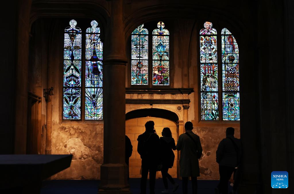 People look at the stained glass windows by Jean Cocteau at Saint-Maximin church in Metz, Moselle, the Grand Est Region, France, March 30, 2025. The Michelin Guide France launched its 2025 Ceremony in Metz on Monday. The event unveiled the Michelin Guide France 2025 selection along with a series of celebrations. (Xinhua/Gao Jing)