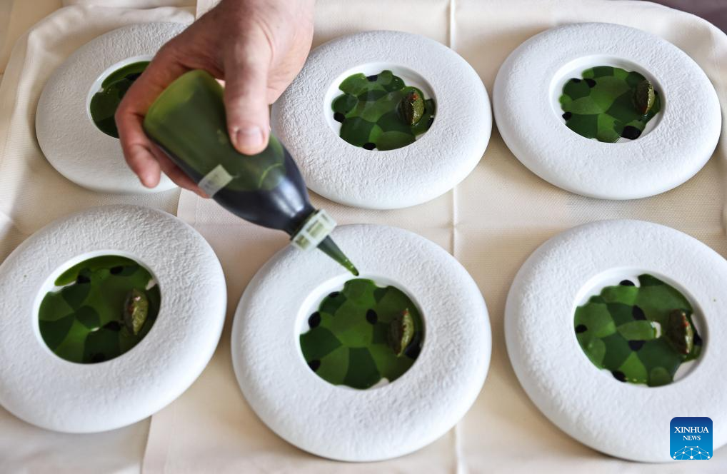 A two-star Michelin chef prepares food near Metz, Moselle, the Grand Est Region, France, March 31, 2025. The Michelin Guide France launched its 2025 Ceremony in Metz on Monday. The event unveiled the Michelin Guide France 2025 selection along with a series of celebrations. (Xinhua/Gao Jing)