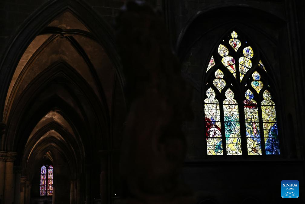 Stained glass windows by Marc Chagall are seen inside the Metz cathedral in Metz, Moselle, the Grand Est Region, France, March 30, 2025. The Michelin Guide France launched its 2025 Ceremony in Metz on Monday. The event unveiled the Michelin Guide France 2025 selection along with a series of celebrations. (Xinhua/Gao Jing)