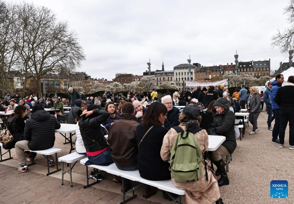 Local people take part in a food festival at a square in Metz, Moselle, the Grand Est Region, France, March 30, 2025. The Michelin Guide France launched its 2025 Ceremony in Metz on Monday. The event unveiled the Michelin Guide France 2025 selection along with a series of celebrations. (Xinhua/Gao Jing)