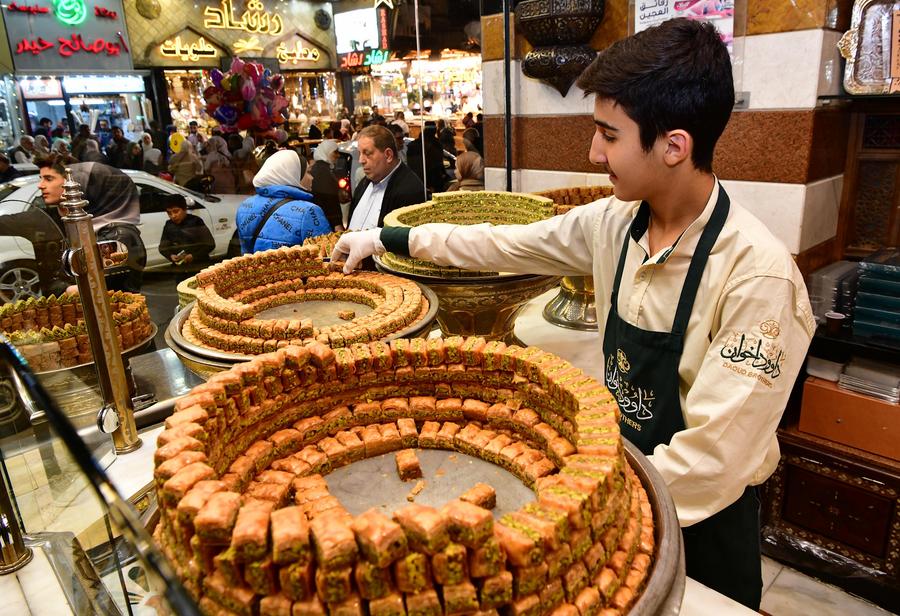 A vendor prepares food at a market on the eve of the Eid al-Fitr holiday in Damascus, Syria, on March 30, 2025. (Photo by Ammar Safarjalani/Xinhua)