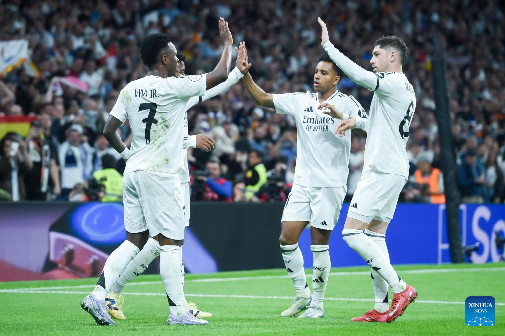 Players of Real Madrid celebrate a goal during the Copa del Rey semifinal 2nd leg football match between Real Madrid and Real Sociedad, in Santiago Bernabeu Stadium, Madrid, Spain, on April 1, 2025. (Photo by Gustavo Valiente/Xinhua)