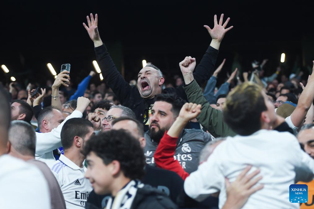Fans of Real Madrid celebrate a goal during the Copa del Rey semifinal 2nd leg football match between Real Madrid and Real Sociedad, in Santiago Bernabeu Stadium, Madrid, Spain, on April 1, 2025. (Photo by Gustavo Valiente/Xinhua)