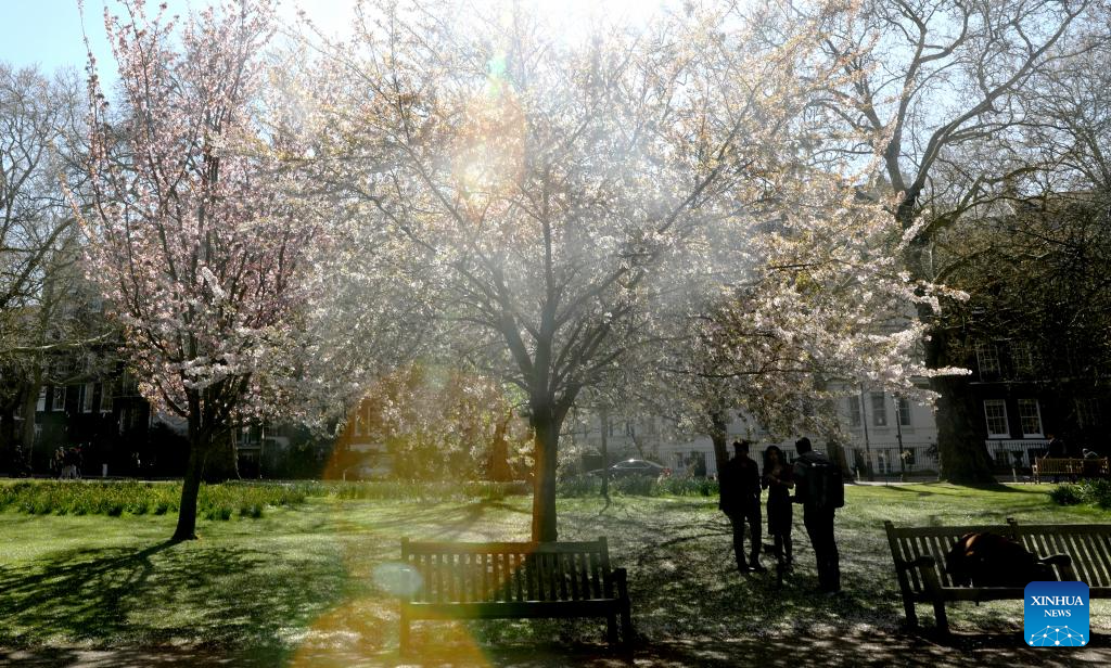 People stand under a blooming cherry tree at St James's Park in London, Britain, April 1, 2025. (Xinhua/Li Ying)
