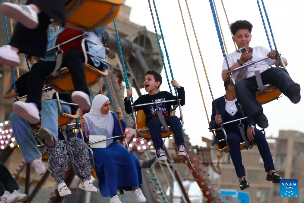 People ride on a swing carousel at an amusement park during the Eid al-Fitr holiday in Cairo, Egypt, on April 1, 2025. (Xinhua/Ahmed Gomaa)