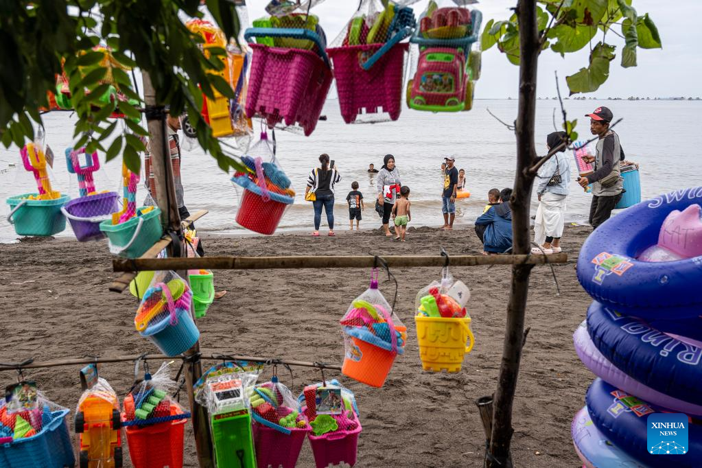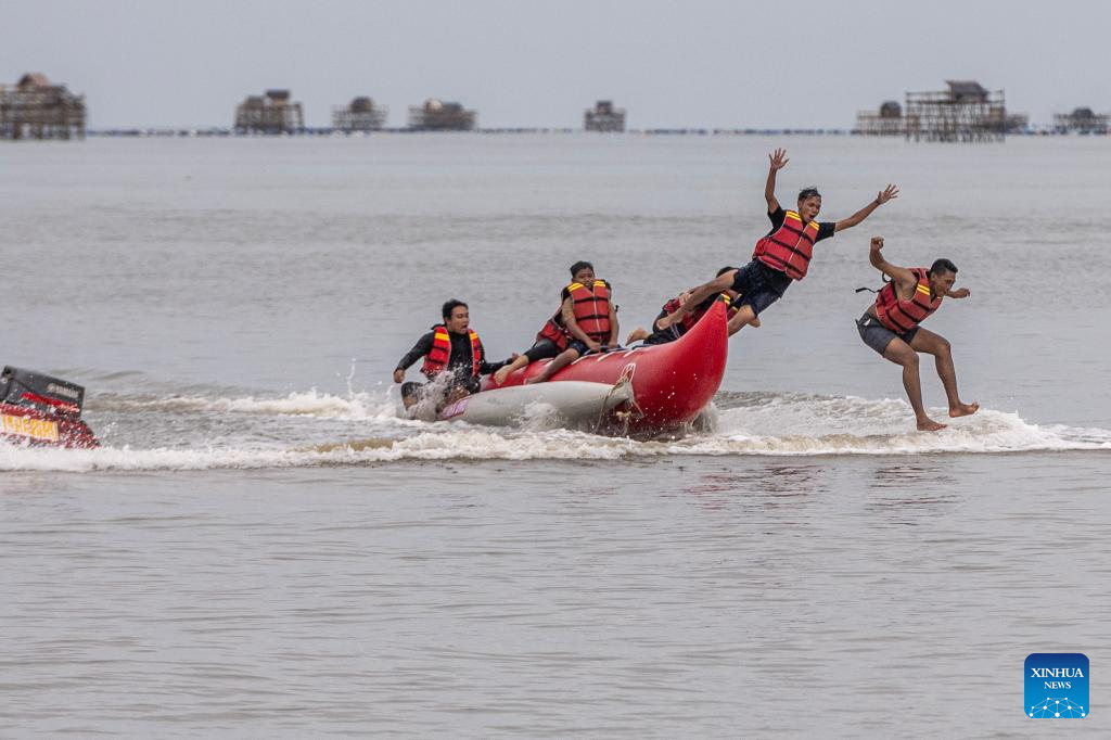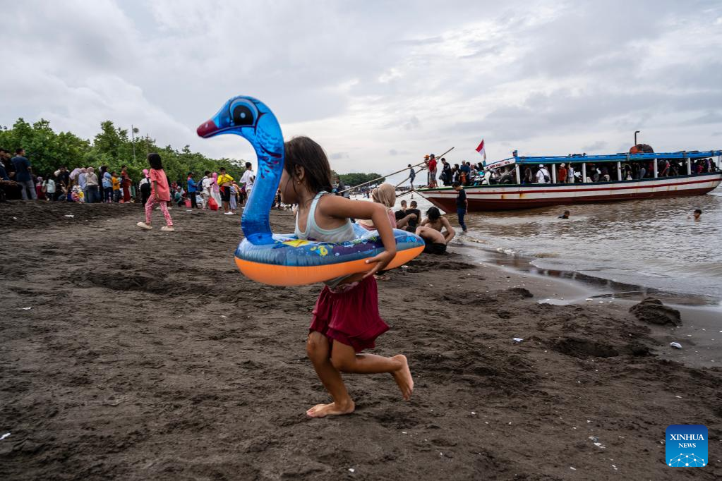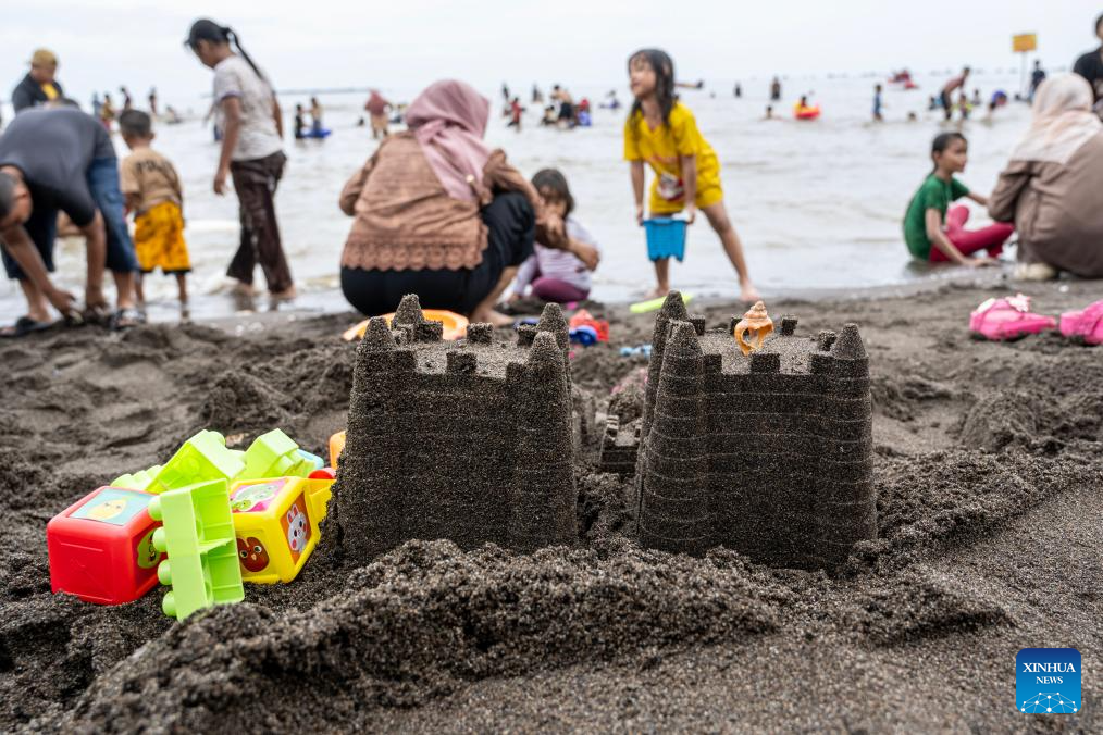 People have fun at Tanjung Pasir Beach during Eid al-Fitr holidays in Tangerang of Banten province in Indonesia on April 1, 2025. (Xinhua/Veri Sanovri)