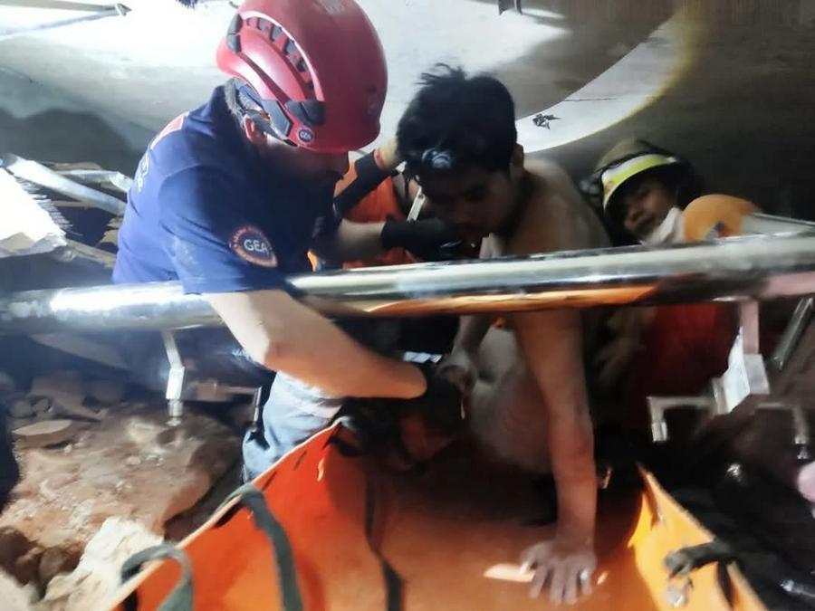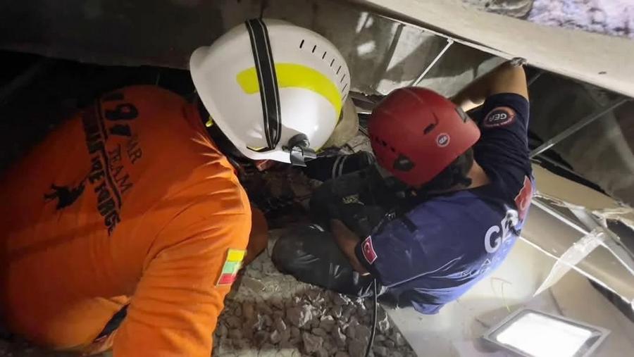 Two people were trapped under the debris, and rescue teams from the Myanmar Fire Services Department and Turkey successfully pulled one survivor to safety, the information team said.
