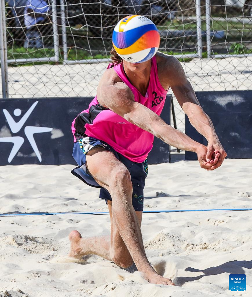 Jack Pearse of Australia competes during the men's pool A match between D'Artagnan Potts/Jack Pearse of Australia and Surin Jongklang/Kittituch Khomkham of Thailand at the AVC Beach Volleyball Tour 2nd Nuvali Open in Laguna Province, the Philippines, April 3, 2025. (Xinhua/Rouelle Umali)
